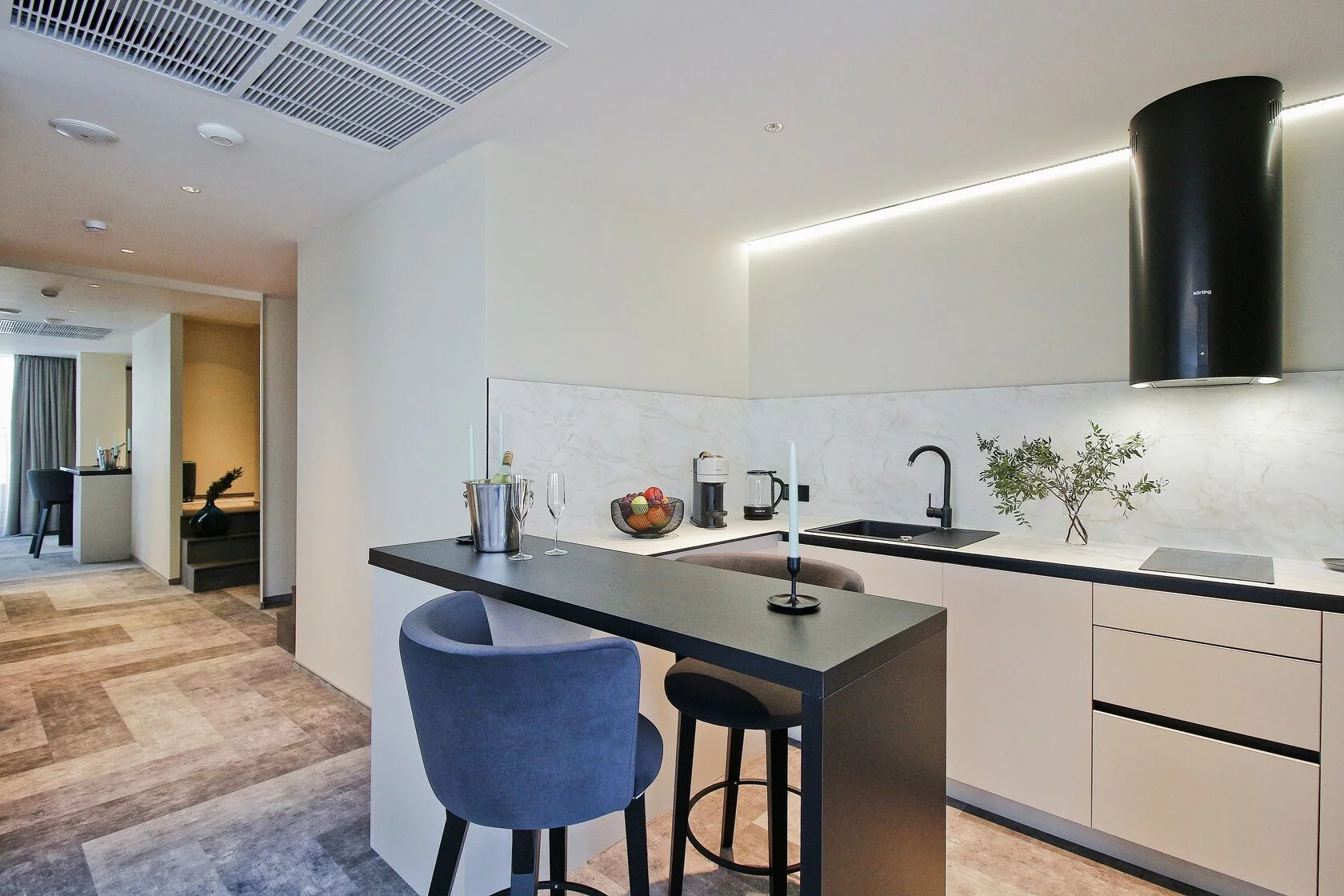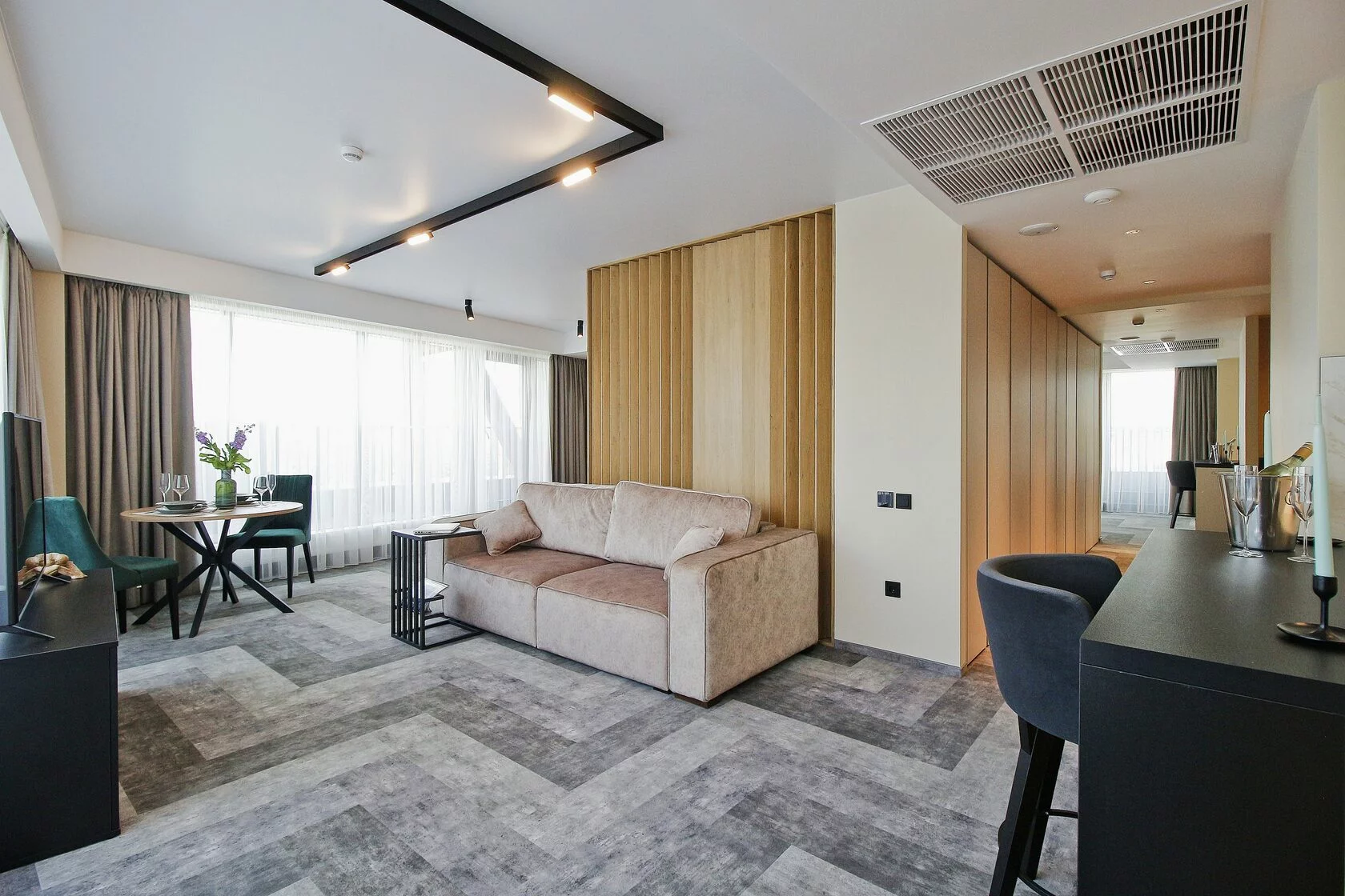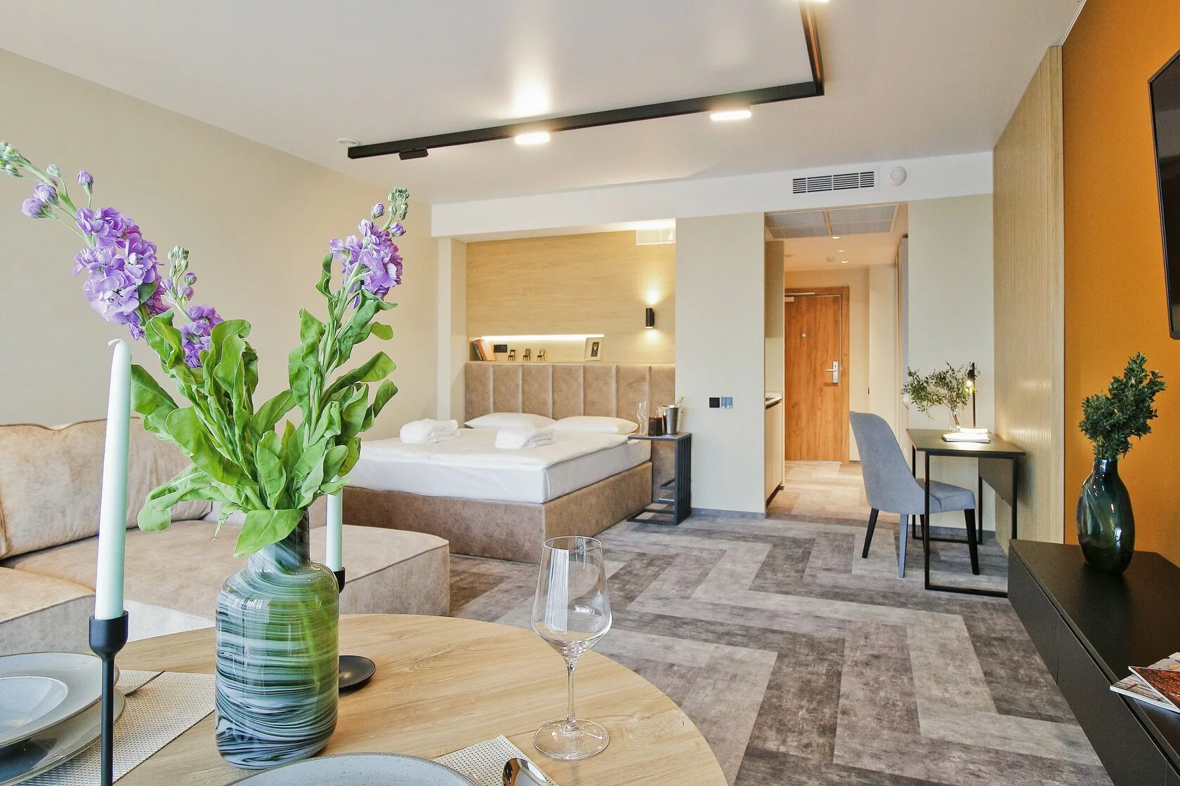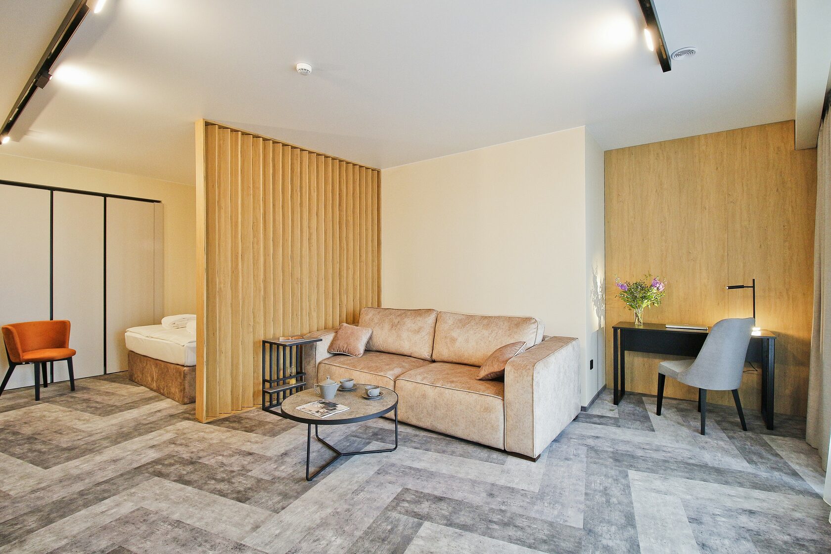 Спокойный минималистичный интерьер в теплой песчаной гамме дает отсылку к дюнам на побережье Балтийского моря. Натуральный дизайн и мягкие приглушенные тона интерьеров Апарт-отеля «Lastadie» создают неповторимую атмосферу сочетания стиля и комфорта.